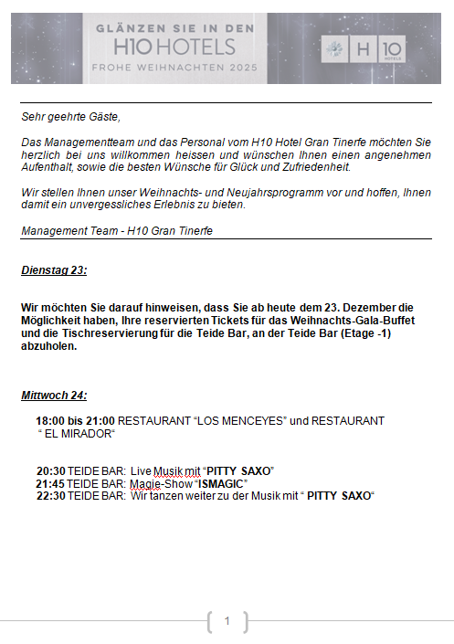 Die Direktion und das gesamte Personal des Hotels H10 Gran Tinerfe heißen Sie herzlich willkommen und wünschen Ihnen einen angenehmen Aufenthalt bei uns, sowie unser Bestes an Glück und Wohlstand.
