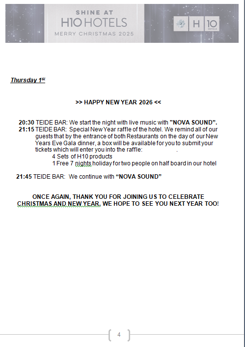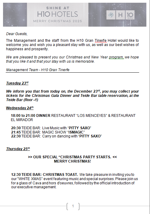 The Management and all the staff of Hotel H10 Gran Tinerfe welcome you, wishing you a pleasant stay with us, as well as our best wishes for happiness and prosperity.