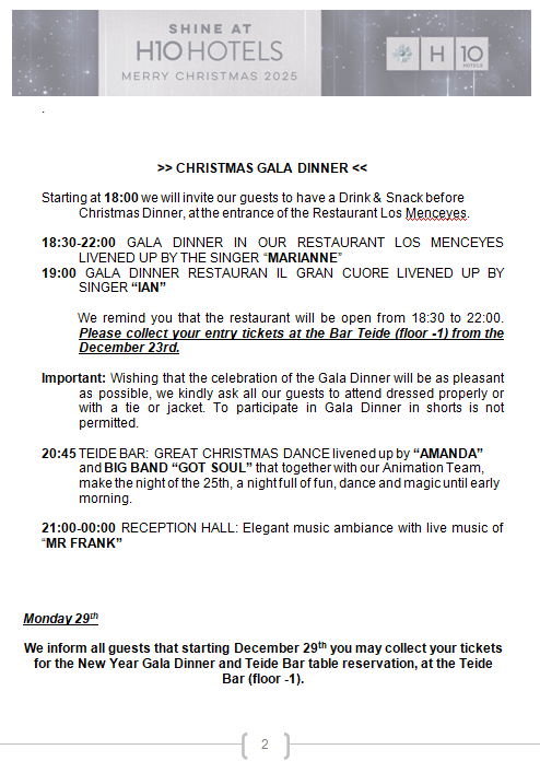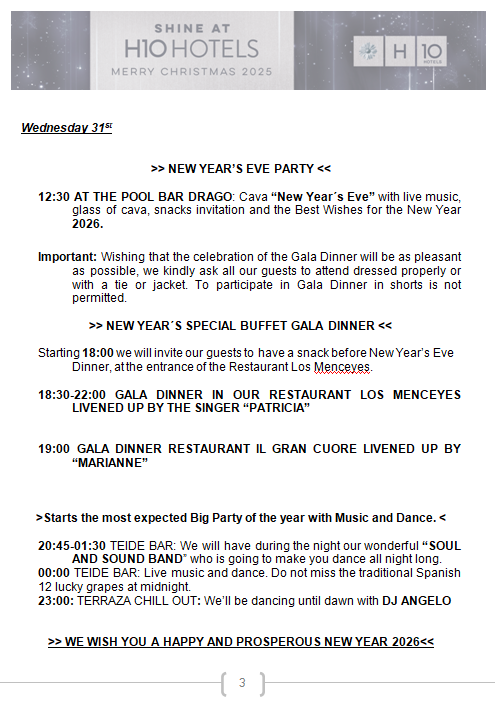 We are pleased to present our Christmas and New Year Program, which we hope will be to your liking and make your stay unforgettable.