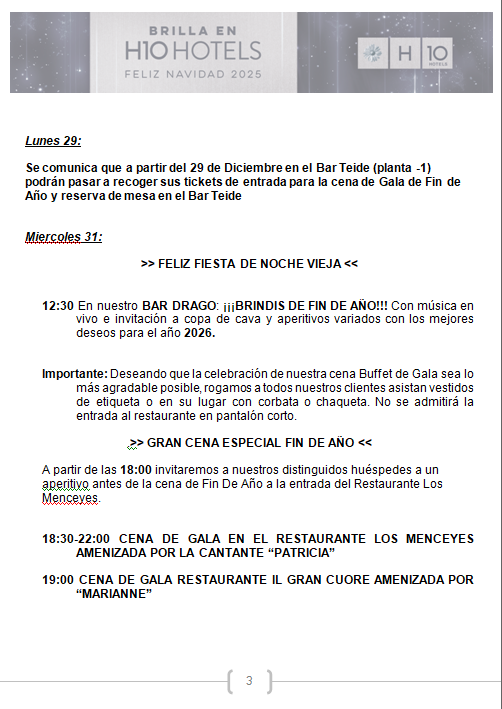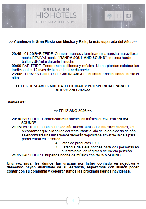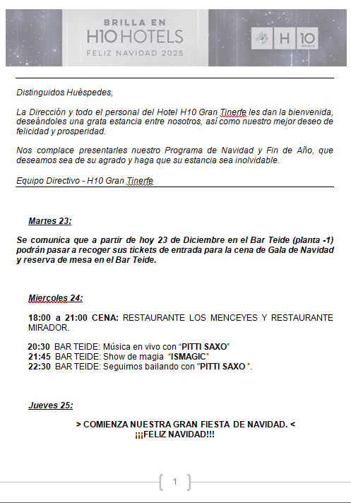 La Dirección y todo el personal del Hotel H10 Gran Tinerfe les dan la bienvenida, deseándoles una grata estancia entre nosotros, así como nuestro mejor deseo de felicidad y prosperidad.